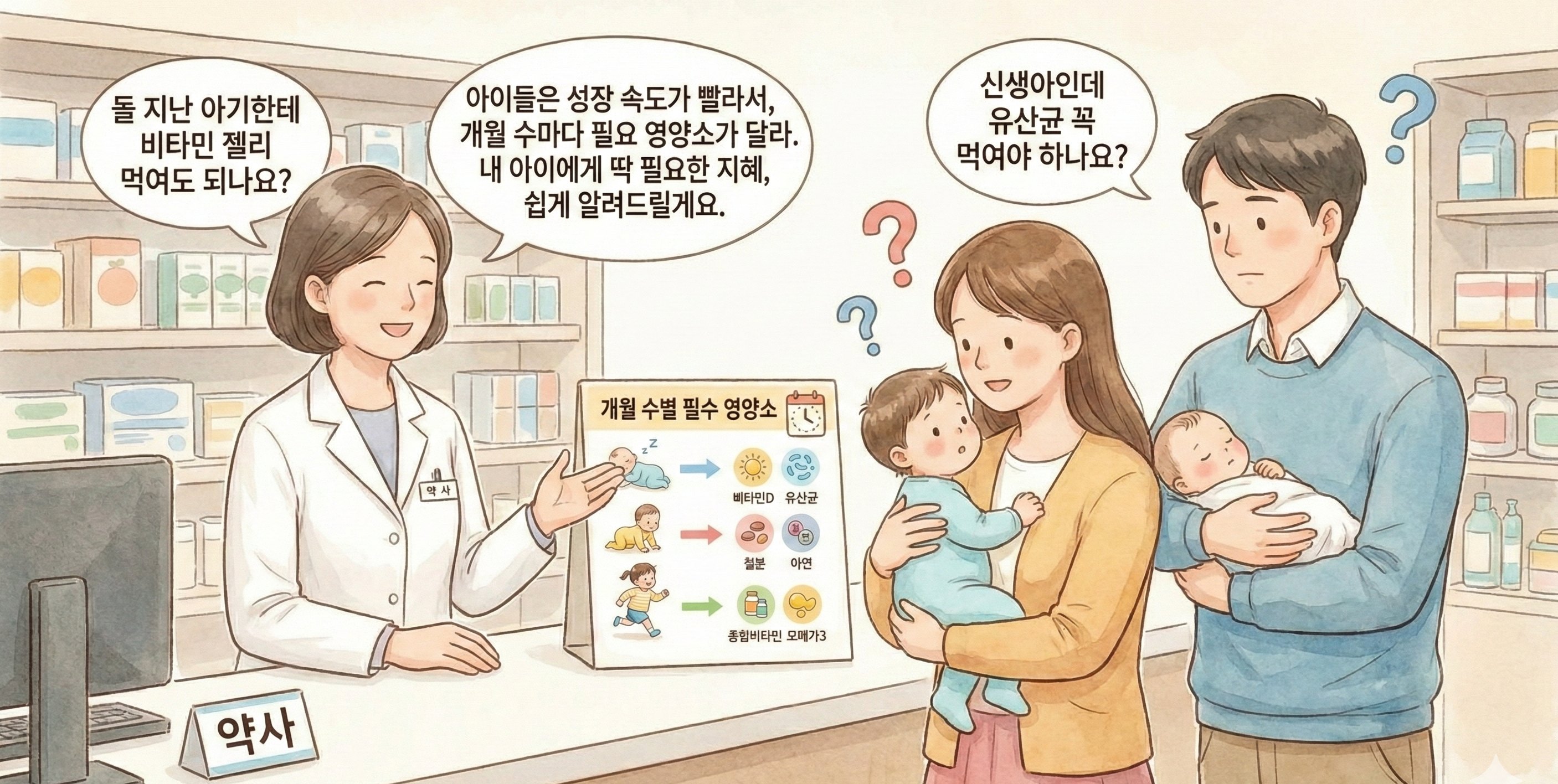 약국에 오시는 부모님들이 가장 많이 하시는 고민 중 하나가 바로 "우리 아이 나이에 도대체 뭘 먹여야 하나요?"입니다.