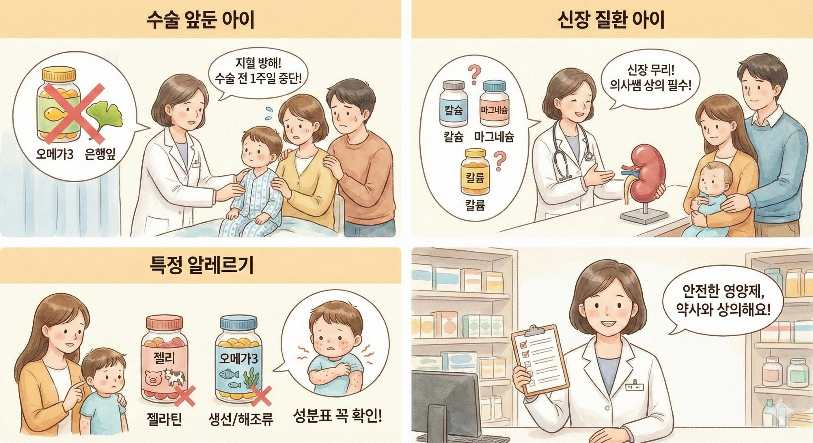 - 수술을 앞둔 아이: 오메가3, 은행잎 추출물 등은 혈액 순환을 돕지만, 지혈을 방해할 수 있어요. 큰 수술 전에는 최소 1주일 중단해야 합니다.
