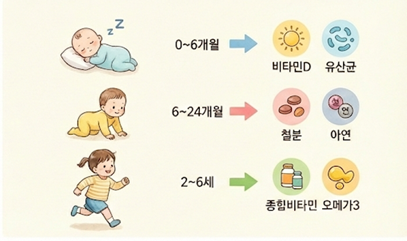 오늘은 '성분'을 중심으로 0세부터 6세까지 시기별 꼭 필요한 영양제 로드맵을 정리해 드릴게요.